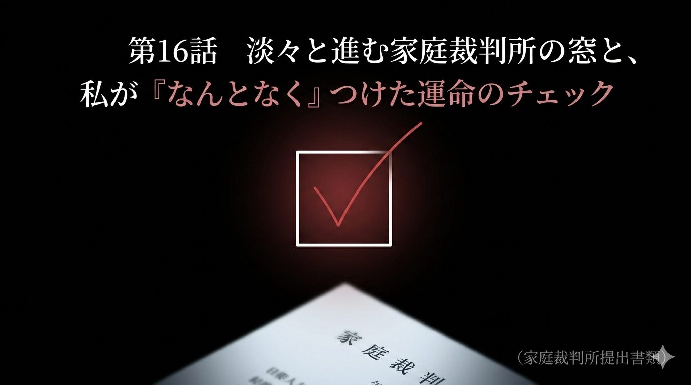 家庭裁判所の冷たい窓口。事務的に渡された書類に、震える手で「なんとなく」つけた一つのチェックマーク。知識も余裕もなかったあの時の決断が、私の人生と子供たちを守る運命の分かれ道になるとは…。孤独とサバイバルの記録、第16話。