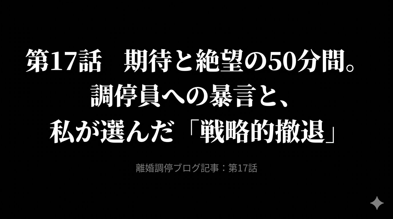 「第三者を交えれば、やっとまともな話し合いができる」——そう信じて挑んだ初めての離婚調停。しかし待っていたのは、調停員にまで牙を剥く夫の異常な「暴言の嵐」でした。期待が絶望に変わった50分間。会話が成立しない相手を前に、私が選んだのは戦うことではなく「戦略的撤退」でした。自分の人生と足場を固め直す、決意の第17話。